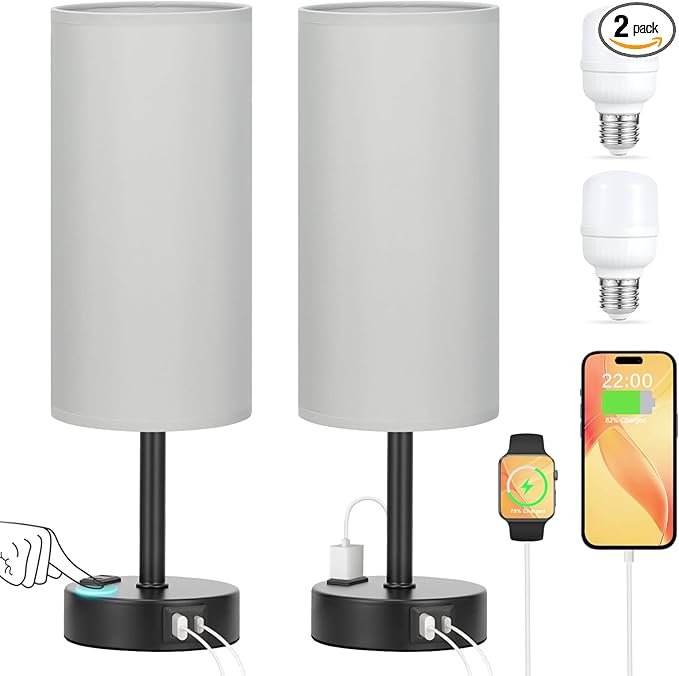 Grey Touch Table Lamps Set of 2-3 Way Dimmable Bedroom Lamps for Bedside with USB C and A Ports, Small Nightstand Lamps with AC Outlet, Desk Lamps with Black Base for Office Boys