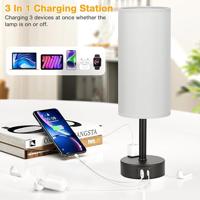 - 2. USB-A & USB-C Charging Ports and Outlet - Power 6 devices at once bed side lamps set! With 2 usb-c ports (5V/2.1A) and 2 usb-a ports (5V/2.1A) and 2 outlets (120v) on the nightstand lamps set of 2, getting your phones, pad, laptops, humidifier, kindle, headsets, speaker, earbuds and other electronics fully charged all from the usb lamps for bedrooms set of 2 no matter if the touch lamp is on or off.