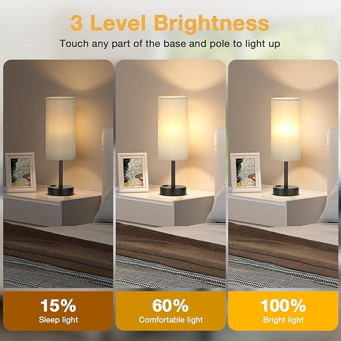 - 1. Touch Control Bedside Lamps - The smooth dimmable table lamps set of 2 feature with touch-sensitive sensor, to make quick changes to 3 different level brightness (Low, Medium, High), and soften the atmosphere quickly for you. Simply a touch or a pat on the nightstand lamp's base or pole when you want the night stand lamps On/Off, brighter/dimmer. (Used as a night lamp at low brightness, medium/high is enough to meet your needs for reading/working.)