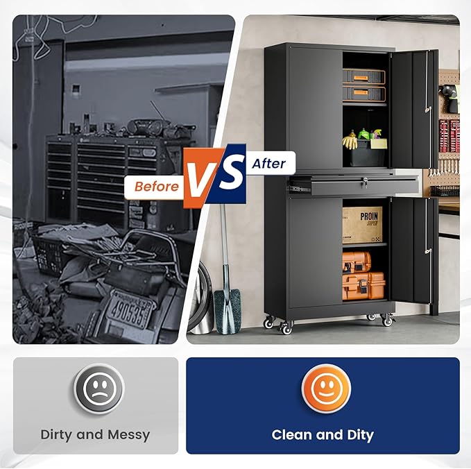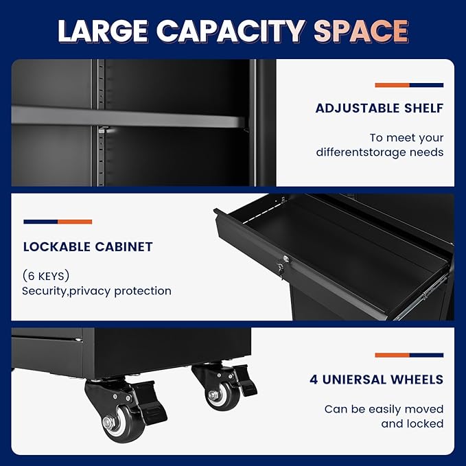 - 『PRACTICAL DESIGN』:Our tall metal cabinet equipped with 1 drawer and 2 adjustable shelves to provide adaptability and convenience. Wheels(2 lockable wheels) with 360° rotation can easily move to anywhere & stay in a fixed position. High-grade lock picking to secure valuables.cabinet has three locks each with two keys,regardless of what your storage needs are, you have the ability to create a unique storage space to suit them.