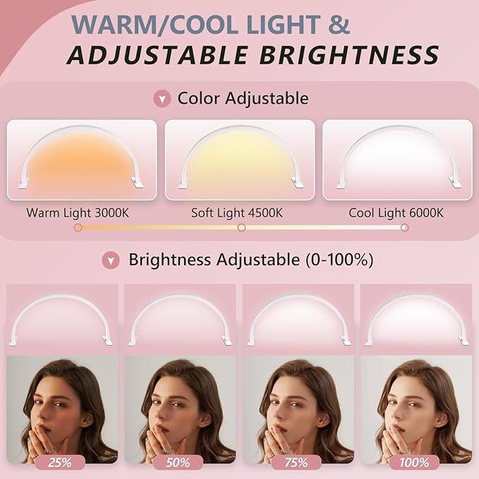 - FUNCTIONAL & ERGONOMIC DESIGN : With its unique half-moon lamp tube shape, this beauty lamp offers a distinctive advantage-Shadow-Free Illumination. The tube can be positioned at any angle, and a touch switch allows you to easily adjust the lighting angle, providing perfect illumination for intricate beauty routines.
