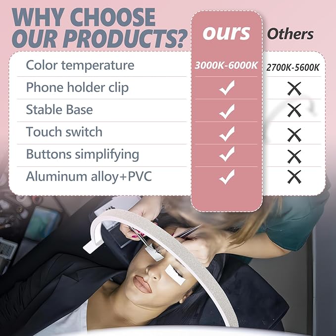 - STURDY FRAME & BASE : Crafted with a robust aluminum alloy and PVC, this LED lash lamp combines lightweight construction with remarkable durability; And the solid and heavy flat base is designed to avoid any tip overs.