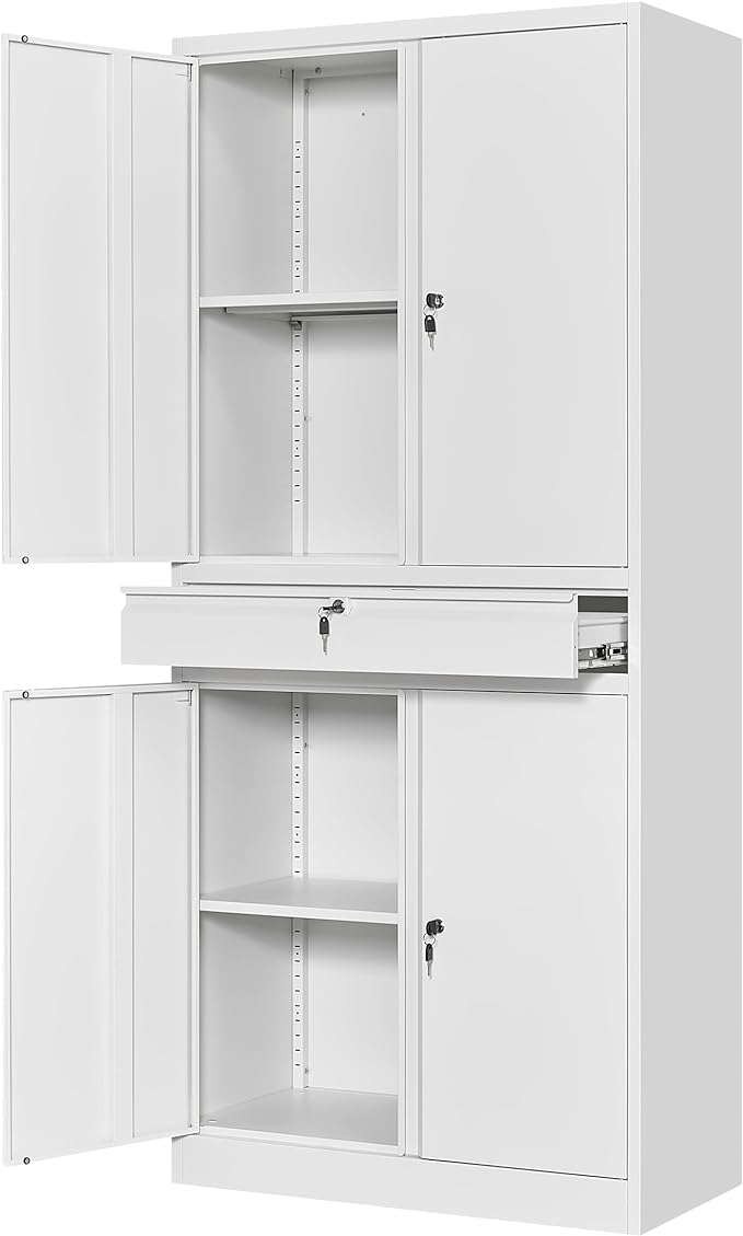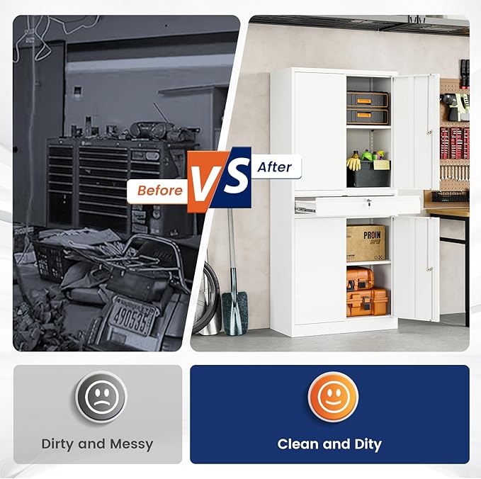 - 『PRACTICAL DESIGN』:Our tall metal cabinet equipped with 1 drawer and 2 adjustable shelves to provide adaptability and convenience. High-grade lock picking to secure valuables, two keys are included. Regardless of what your storage needs are, you have the ability to create a unique storage space to suit them.