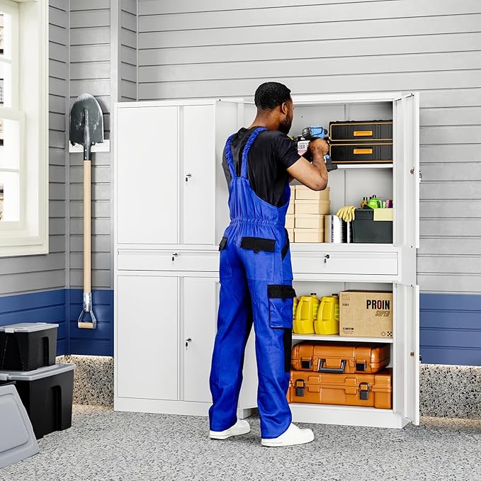 Yizosh Metal Garage Storage Cabinet with Locking Doors and Adjustable Shelves, 71" Tool Storage Cabinet with 1 Drawer for Garage,Office,Warehouse (White)