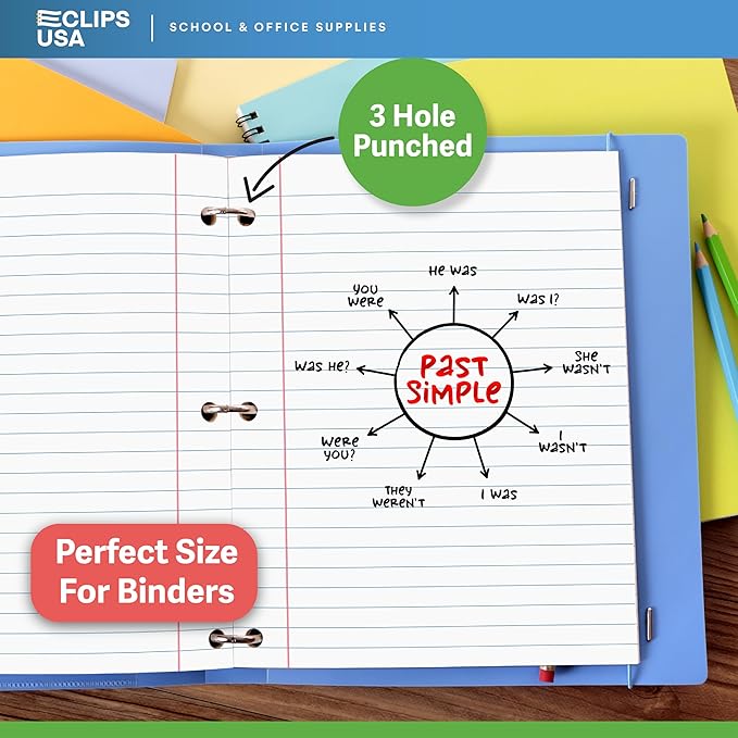 - FITS IN 3 RING BINDERS - Loose leaf paper wide ruled fits most 3 ring binders. High quality wide ruled notebook paper to prevent tearing from binders.