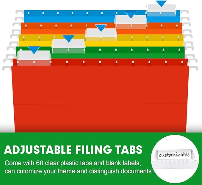 - LABELS AND INSERT INCLUDED: Hanging file folders Letter size come with 60 pack adjustable clear tabs and 60 removable blank label inserts, customize your own cover for different topics and to sort your files by category, date, or priority