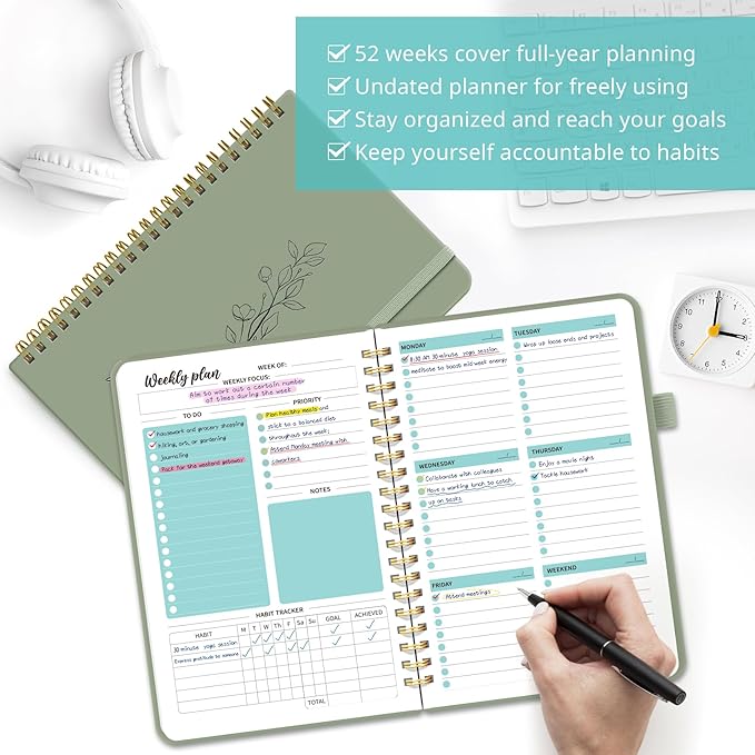 Undated Weekly Planner, Weekly To Do List Notebook with Goal & Habit Tracker Organizer, A5 Weekly Planner Notebook with Spiral Binding, 6.1" x 8.2" - Green