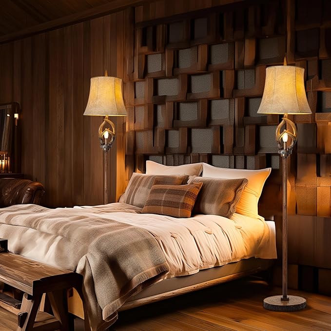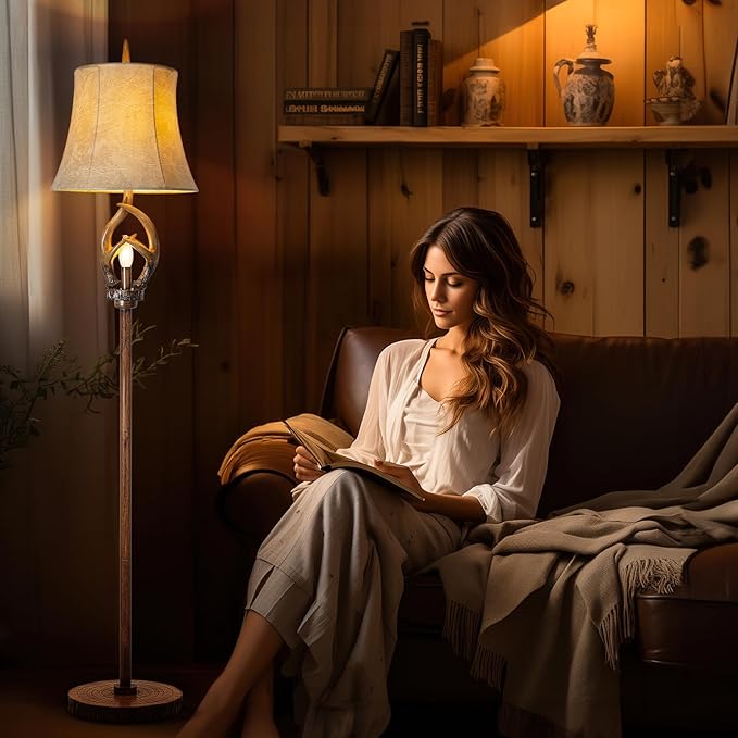 Rustic Farmhouse Antlers Floor Lamp with Night Light Faux Leather Bell Shade Brown Finish Tall Industrial Tall Standing Lamp Decor for Living Room Bedroom Hotel Office (Bulb Included)