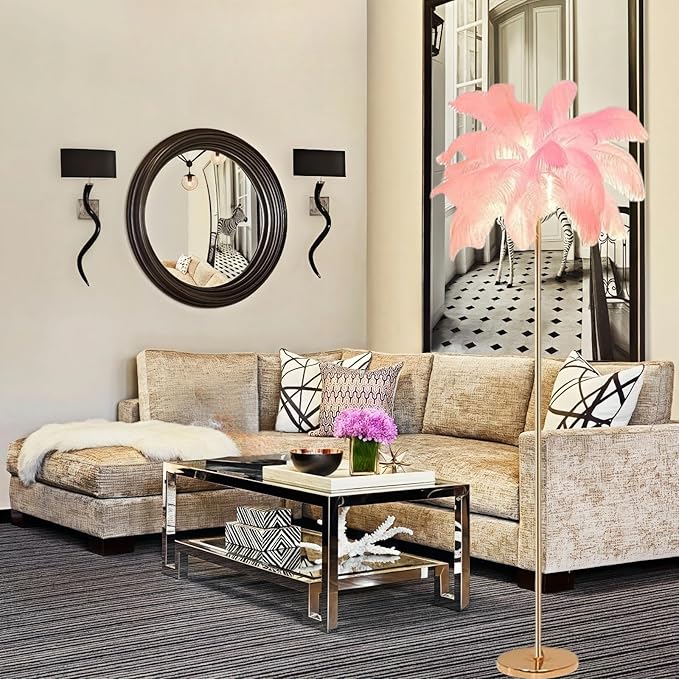 - š” Ostrich Feather Floor Lamp: This is a beautiful light pink feather floor lamp bedroom decoration, full of modern style, which will bring eternal attraction to your home. This pink lampshade is handmade with ostrich feathers and a metal base, equipped with American standard plug button switches, creating a pleasant contrast with the fashionable environment. This type of feather floor lamp is also suitable for living rooms or bedrooms, and the pink light makes the atmosphere of the entire