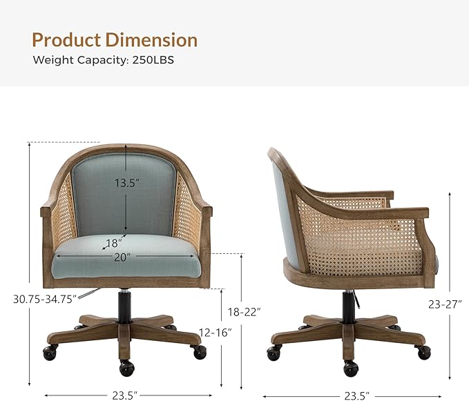 TINA'S HOME Rattan Desk Chair, Wood Upholstered Home Office Chair with Armrest, Adjustable Swivel Rolling Height Computer Task Chair for Living Room Bedroom Study Room, Blue