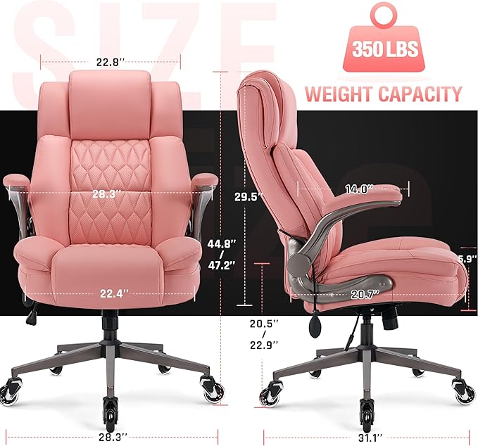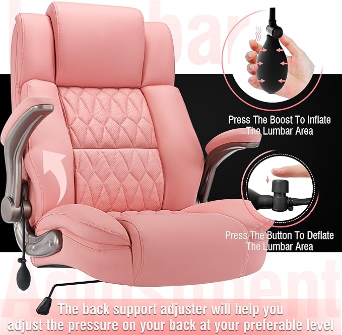 Large High Back Office Chair - Adjustable Lumbar Support Flip Up Arms Heavy Duty Quiet Wheels Metal Base Breathable Bonded Leather Ergonomic Executive Computer Desk Chair with Storage Bags, Pink