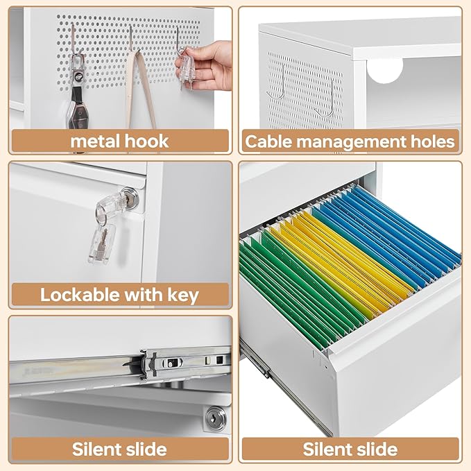 - MULTIPLE DRAWERS: Cabinet has 2 lockable drawers to keep confidential documents and valuables safe, drawers can organize hanging letter, A4 size documents. In addition, it is equipped with 4 hooks for hanging backpacks, earphones, keys and other small items, which is convenient and easy to use at any time.
