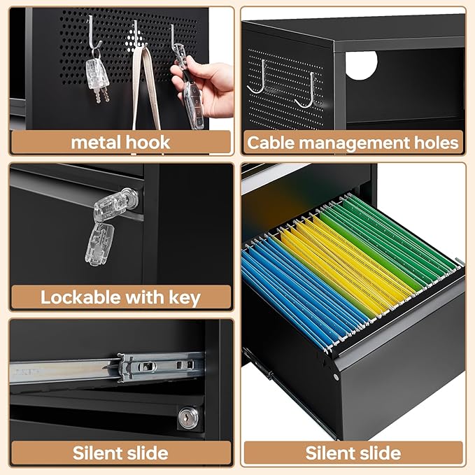 - MULTIPLE DRAWERS: Cabinet has 2 lockable drawers to keep confidential documents and valuables safe, drawers can organize hanging letter, A4 size documents. In addition, it is equipped with 4 hooks for hanging backpacks, earphones, keys and other small items, which is convenient and easy to use at any time.