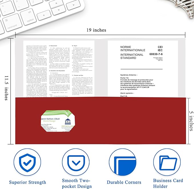 - Professional Design:Two pockets provide storage space for paper,brochures,and more,Each folders for documents measures 9" x 11.5",with two 5" pockets,holds (over 100) sheets of paper,and has a universal business card holder on the right pocket.