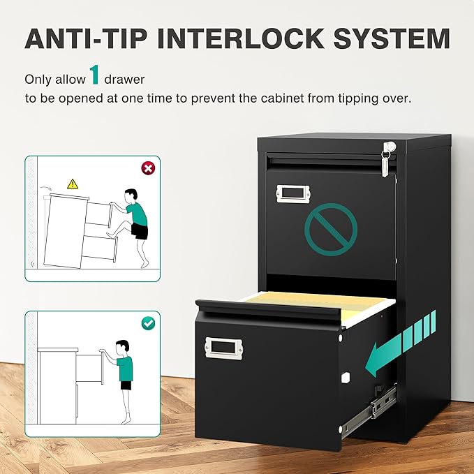 - Anti-tilt Mechanism: All drawer interlocking mechanisms are designed to prevent tilting and ensure that only one drawer can be opened at a time; compact file cabinet with lock and key protect your private documents and valuables effectively.