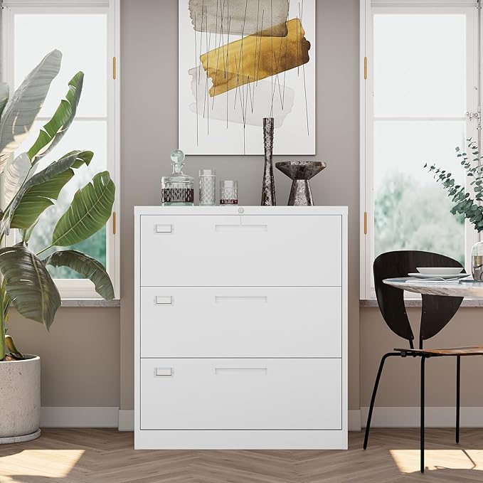 Lateral File Cabinet, Metal Filing Cabinet with Lock, 3 Drawer File Cabinets for Home Office, Office Cabinet for Hanging Files Letter/Legal/F4/A4, Assembly Required, White