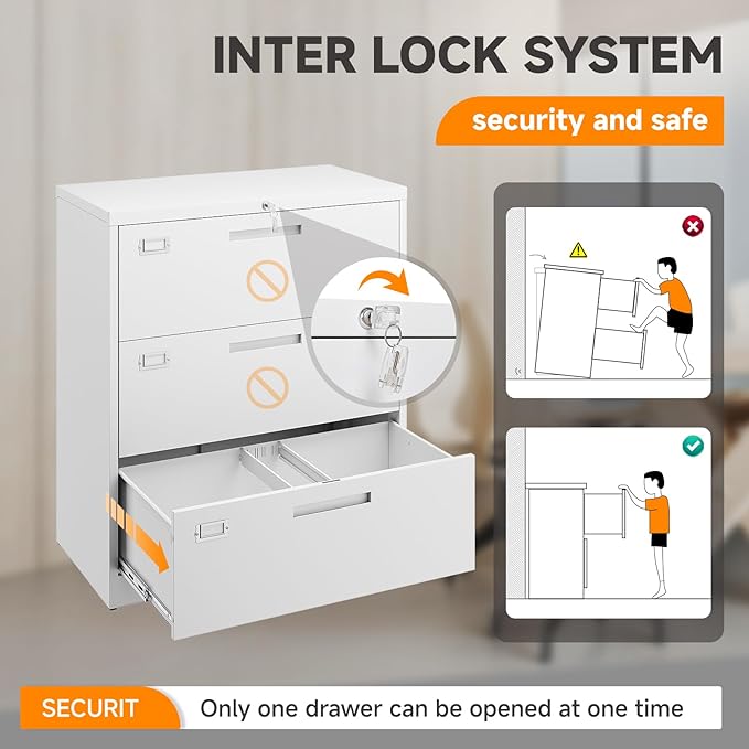 - SECURITY AND ANTI-TIP DESIGN: Metal filing cabinets are equipped with a built-in anti-tip system and folding key locks to secure files and prevent tipping by opening only one drawer at a time.