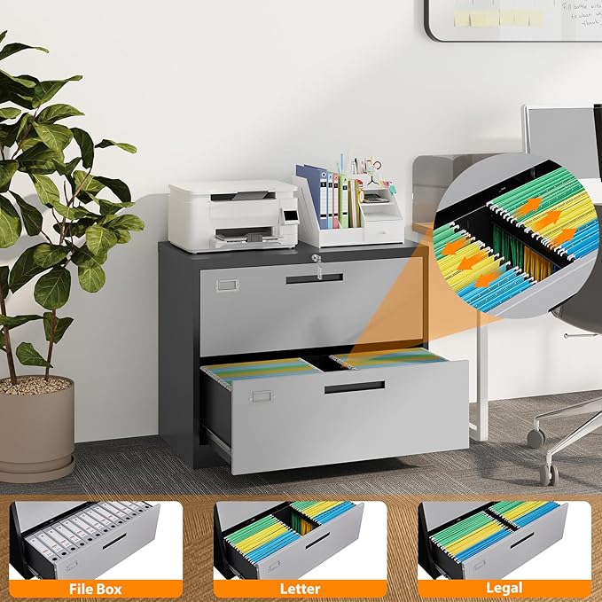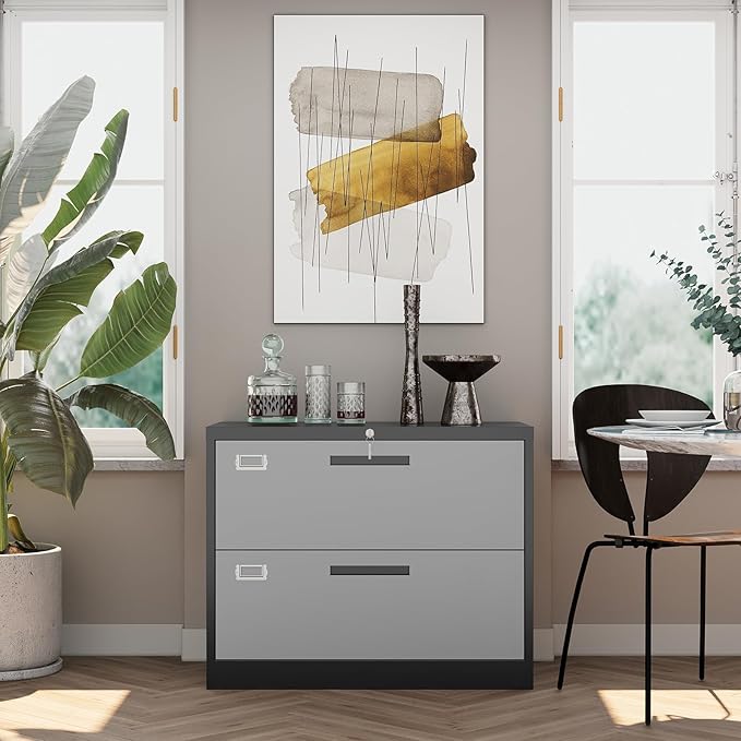 Lateral File Cabinet, Metal Filing Cabinet with Lock, 2 Drawer File Cabinets for Home Office, Office Cabinet for Hanging Files Letter/Legal/F4/A4, Assembly Required, Black Grey