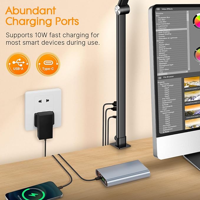 - ššš®š¹ šØš¦š ššµš®šæš“š¶š»š“ š£š¼šæš & š š²šŗš¼šæš ššš»š°šš¶š¼š» - The desk lamp is equipped with a USB charging port and a Type-C charging interface, allowing you to charge two devices at the same time while enjoying the illumination of the led desk lamp for home office. Meanwhile the memory function ensures your last settings are restored and eliminates the hassle of reconfiguring the lights after each turn on.