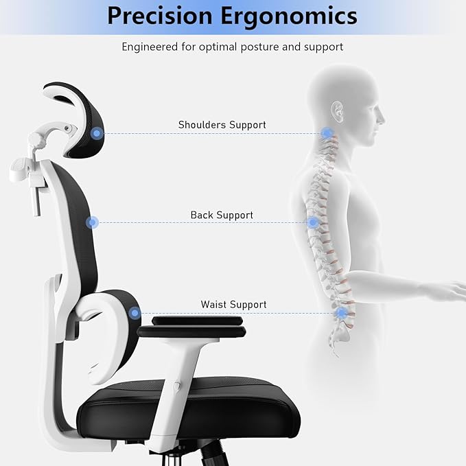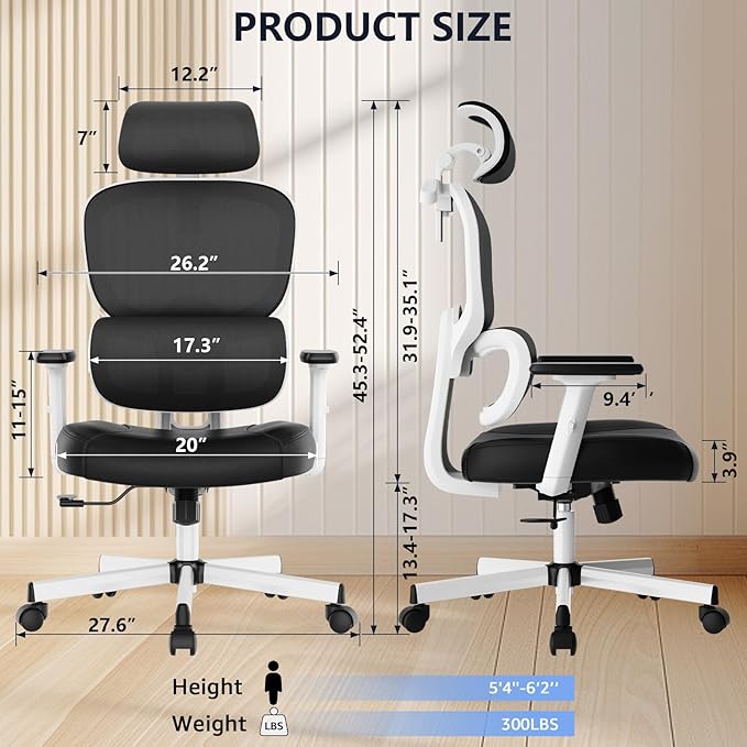 - 【Ergonomic Design】: This ergonomic office chair provides essential support for the head, back, hips,arms and lumbar, promoting spine health and reducing muscle fatigue. Easily adjust the seat height, headrest, backrest, and arms to suit different needs, making it perfect for long hours of office sitting.