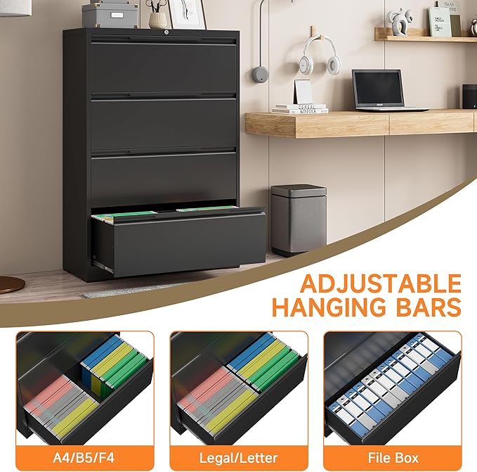 - [Practical Large Space] This 4-drawer file cabinet has a large storage space. 15.74 inches deep x 35.43 inches wide x 51.81 inches high. The top platform of the office file cabinet doubles as a printer stand. Each drawer has adjustable hanging bars so you can adjust the bars as needed and store A4/F4/Letter/Legal and more.