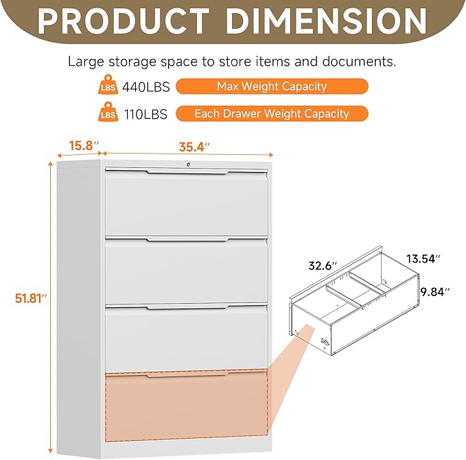 - [Practical Large Space] This 4-drawer file cabinet has a large storage space. 15.74 inches deep x 35.43 inches wide x 51.81 inches high. The top platform of the office file cabinet doubles as a printer stand. Each drawer has adjustable hanging bars so you can adjust the bars as needed and store A4/F4/Letter/Legal and more.