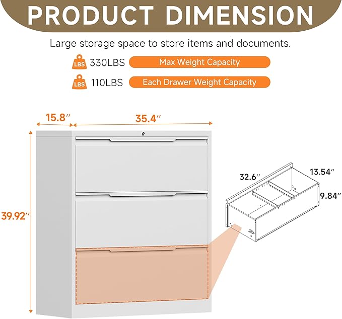 - [Practical Large Space] This 3-drawer file cabinet has a large storage space. 15.74 inches deep x 35.43 inches wide x39.92 inches high. The top platform of the office file cabinet doubles as a printer stand. Each drawer has adjustable hanging bars so you can adjust the bars as needed and store A4/F4/Letter/Legal and more.