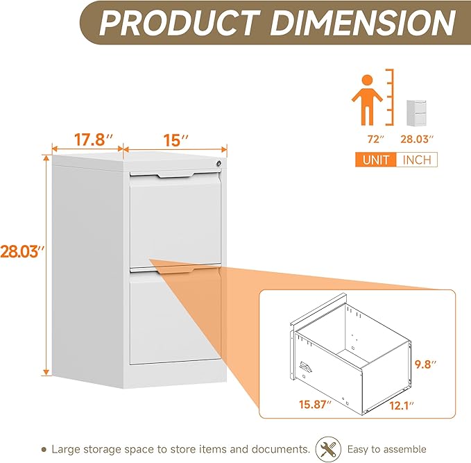 - [Large Storage Space] This 2 drawer file cabinet has a large storage space. 17.8 inches deep x 15 inches wide x 28.03 inches high. The top platform of the office file cabinet doubles as a printer stand. Each drawer has adjustable hanging rods so you can adjust the rods as needed and store A4/F4/Letter/Legal and other items.