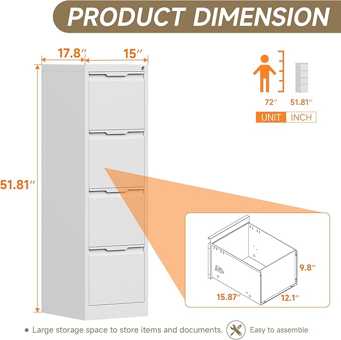 - [Large Storage Space] This 4 drawer file cabinet has a large storage space. 17.8 inches deep x 15 inches wide x 51.81 inches high. The top platform of the office file cabinet doubles as a printer stand. Each drawer has adjustable hanging rods so you can adjust the rods as needed and store A4/F4/Letter/Legal and other items.