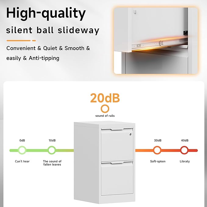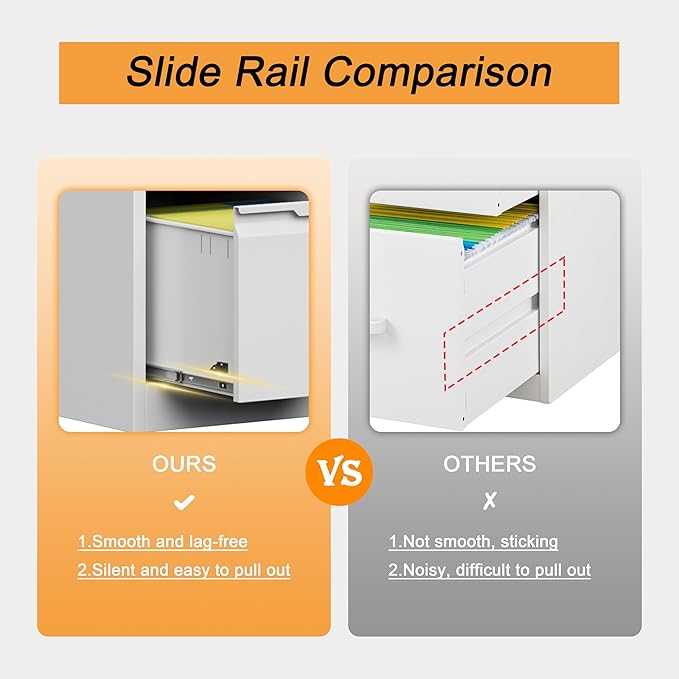 - đăSMOOTH MUTE SLIDE RAILSă: Our metal file cabinets are made with full retractable mute slide rails, open and close smoothly, easy to pick up and put down folders without noise. Perfect for office, home and school use. And the vertical appearance design can maximize the effective use of space, so that your space is not wasted!