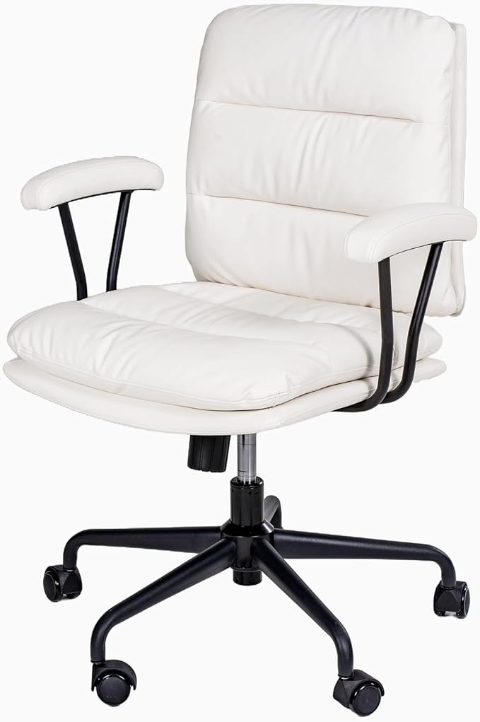 White Leather Desk Chair with Arms,Modern Office Chair with Lumbar Support,Removable Armrests, Height-Adjustable Swivel Medium Computer Chair for Home, Office, Dresser, Bedroom