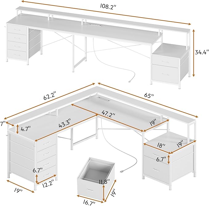 - 【Ideal Space】This computer desk has a spacious desktop. The desktop size is 65"L*19"W and 62.2"L*19"W or 108 inch two person desk. The printer rack can be used for printers of any size commonly seen on the market. The L shaped computer desk could hold three desktop computers and one notebook computer. This computer desk can also be freely deformed into a long square or L-shaped desk according to your use needs.