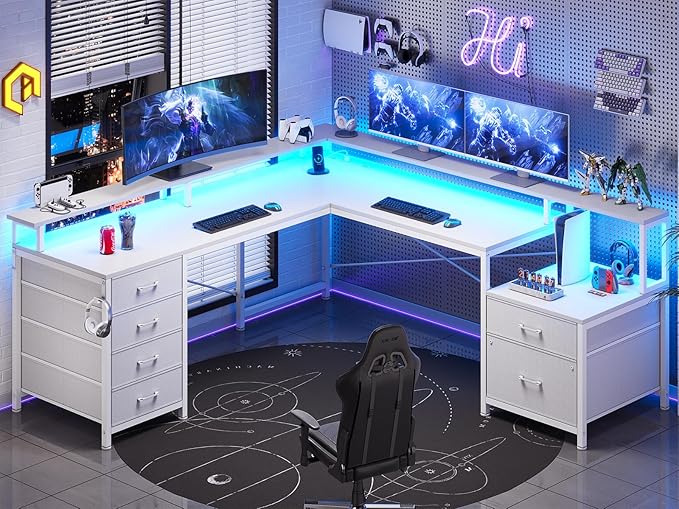 SEDETA L Shaped Desk with 6 Drawer, 108" Home Office Desk with File Drawer & Power Outlet, Corner Computer Desk with Monitor Shelf, File Cabinet, Two Person Desk, Gaming Desk with Led Lights, White