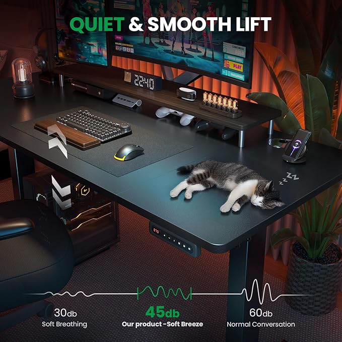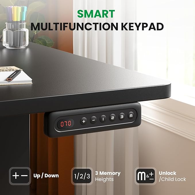 - Customized Sit Stand Desk : The reliable motor operates quietly (under 45 dB)and smoothly, all your things stay steady&secure in motion. The intuitive control panel allows you to preset 3 preferred heights, switch between sitting and standing positions has never been easier. Child lock for total peace of mind.