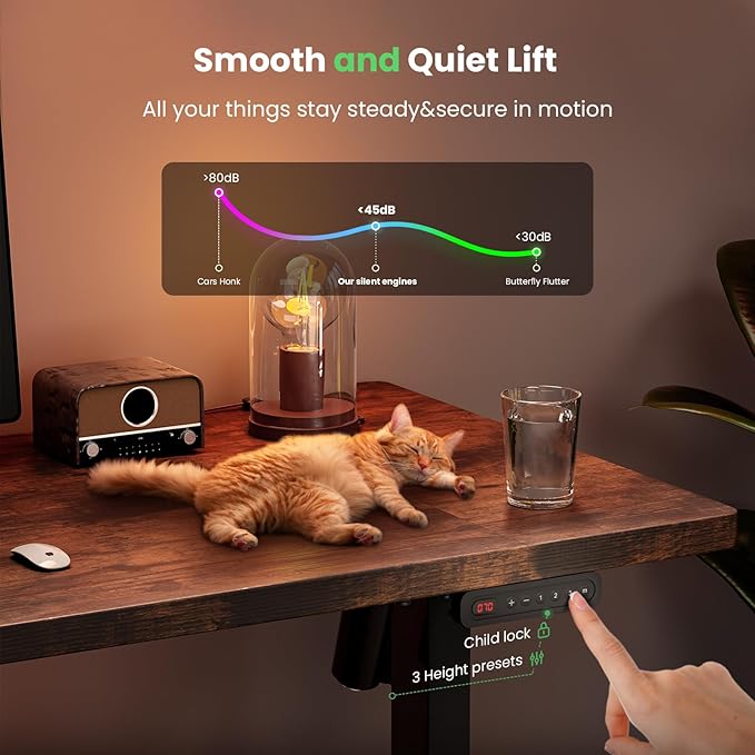 - Customized Sit Stand Desk : The reliable motor operates quietly (under 45 dB)and smoothly, all your things stay steady&secure in motion. The intuitive control panel allows you to preset 3 preferred heights, switch between sitting and standing positions has never been easier. Child lock for total peace of mind.