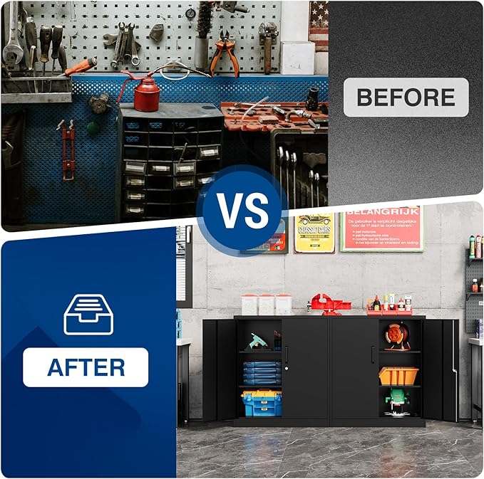 - Adjustable Shelf Height- The Metal Storage Cabinet has 2 adjustable partitions to accommodate items of different heights such as books, toys, kitchen supplies, toiletries, and garage tools. Suitable for garage, bathroom, kitchen, living room, study, office, as a storage cabinet. Use internal space more reasonably.