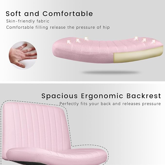 PUKAMI Criss Cross Chair with Wheels,Fabric Padded Armless Cross Legged Office Desk Chair for Home Office,Modern Swivel Height Adjustable Wide Seat Computer Task Vanity Chair(Pink)