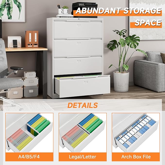 - 【4 Drawer Lateral File Cabinet】Four spacious file drawers accommodate letter and legal size hanging files. The filing drawer supports legal size, A4 size, and letter-size hanging files.