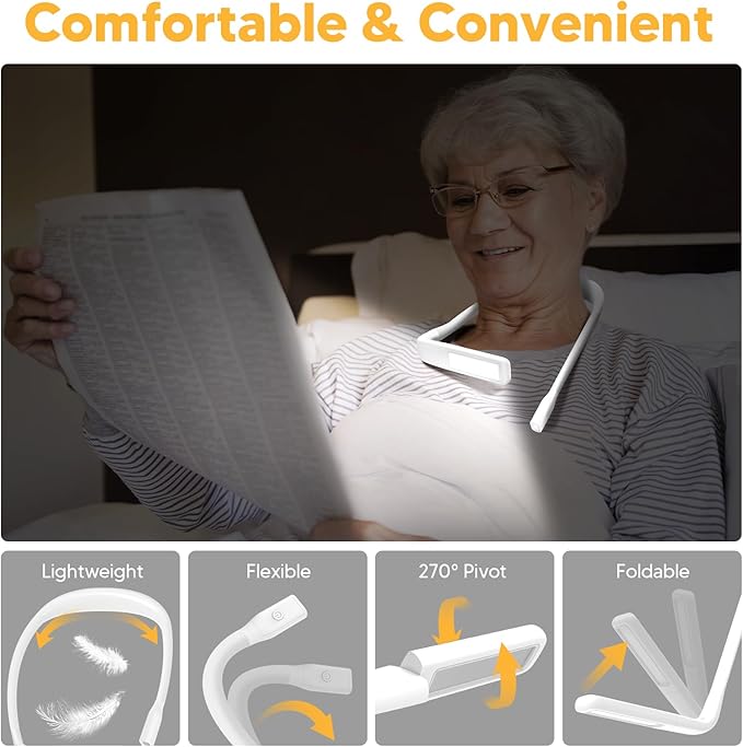 - Comfortable & Versatile: This lightweight, ergonomic neck light features flexible arms and a rotatable head, directing bright light precisely where needed for night reading, crochet, knitting, sewing, crafts, repairing, camping, fishing, or dog walking