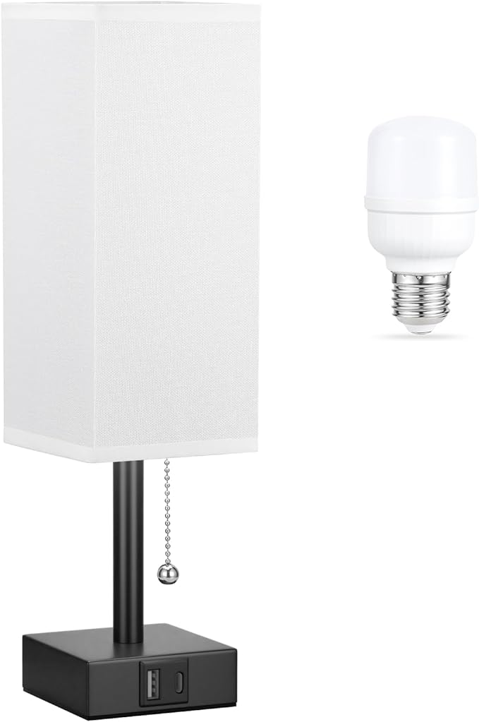 White Small Table Lamp for Bedroom - 3 Color Temperature 3000K 5000K 4000K Bedside Lamp, Pull Chain Control, USB A and C Charging Ports, Black Base, for Kids Office Dorm Nightstand, Bulb Included