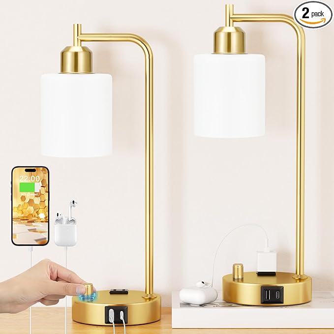 Innqoo Industrial Table Lamps for Bedroom Set of 2 - Fully Dimmable Bedside Lamps with USB Ports and Outlet, Gold Nightstand Lamps with Opal Glass Shade for Living Room, Desk Lamps for Office Reading