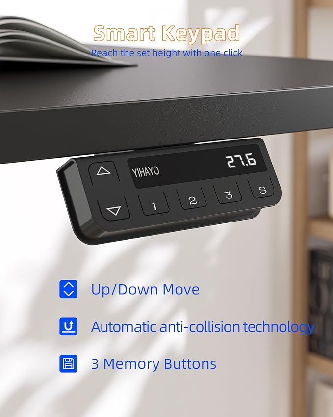 - 【Adjustable Desk】The YIHAYO electric standing desk adjusts from 27.6 to 45.3 inches, accommodating both children and adults. It includes a memory function to store 3 preferred heights for easy one-touch switching between sitting and standing