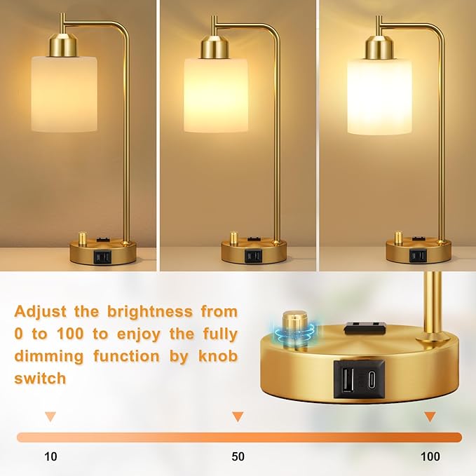 Innqoo Gold Lamp for Bedroom - Industrial Bedside Table Lamp with USB Port and Outlet, Fully Dimmable Nightstand Lamp with Opal Glass Shade, Small Desk Lamps for Home Office