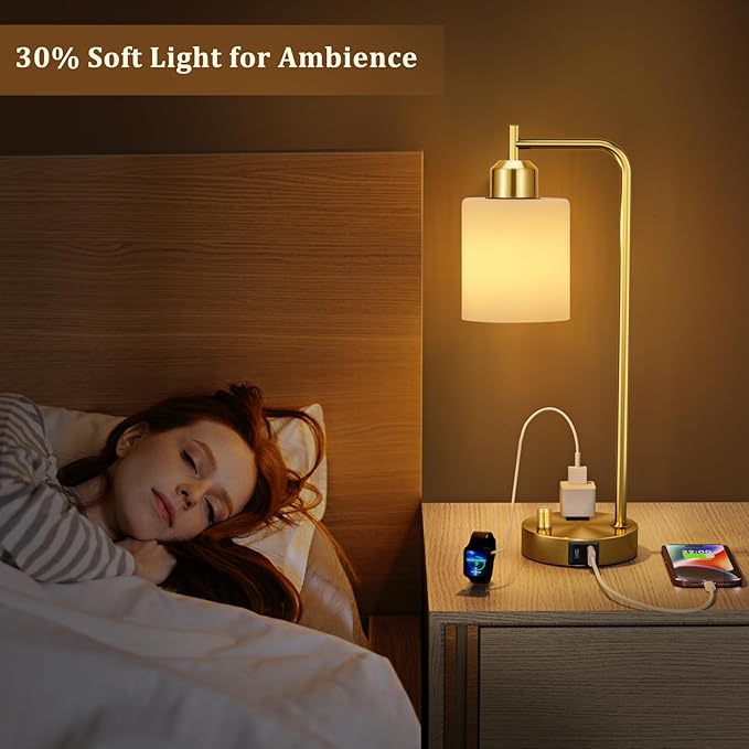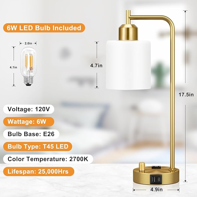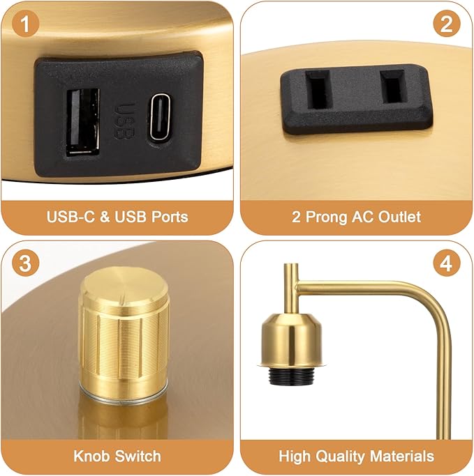 - USB-C & USB & AC OUTLET CHARGING PORTS - The gold lamps with usb port integrated with a USB-C port, a USB port and a 2-prong AC outlet (5V/2.1A), which are available for use whether the industrial lamp for nightstand is on or off. With that you'll have an easy access to charge mobile phones, tablets, kindle readers, power banks, e-watch, mini-humidifier and others.