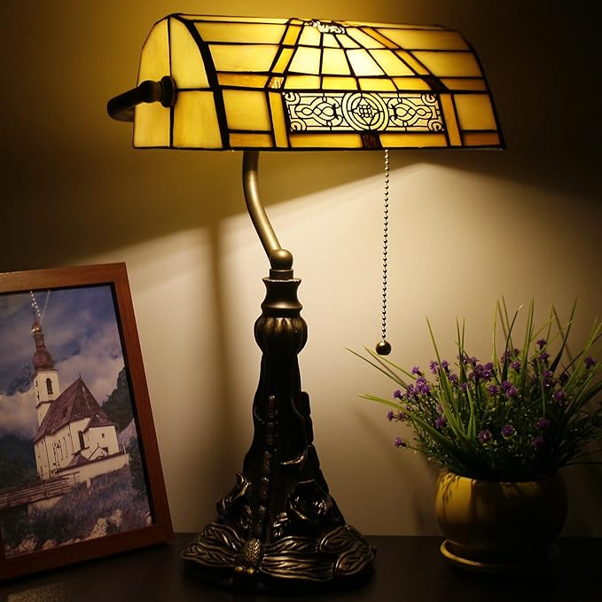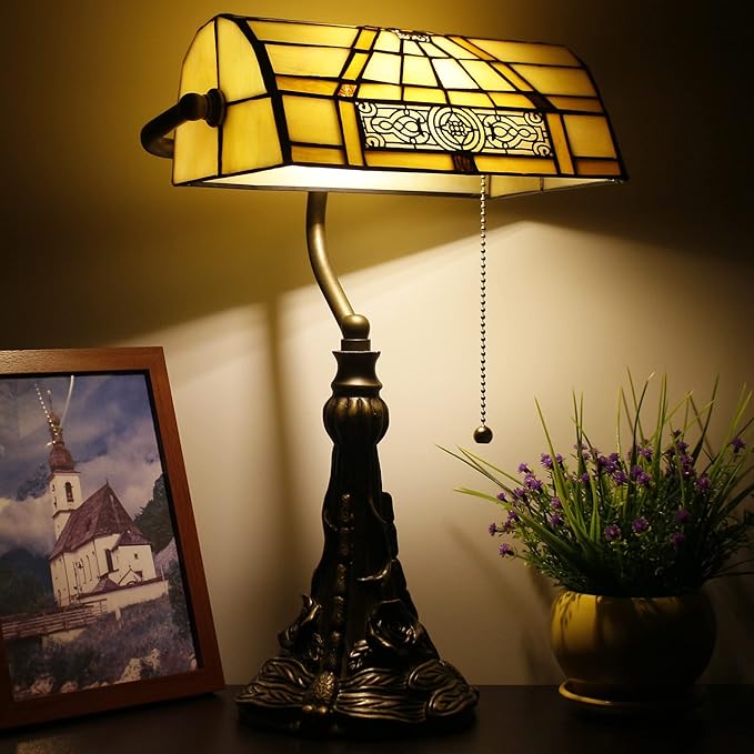 Tiffany Banker Lamp Small Stained Glass Table Lamp Tiffany Style Piano Light Yellow Mission Style Desk Lamp Angle Adjustable 10.6X15.7 Inch for Home Office Living Room Bedroom