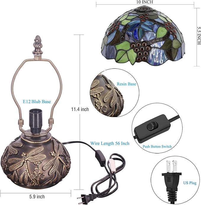 - Product Material: Lampshade handmade, With high-quality stained glass copper foil tin wire welding, Bronze paint resin base, UL certified wire length 56 inch, Push Button Switch.