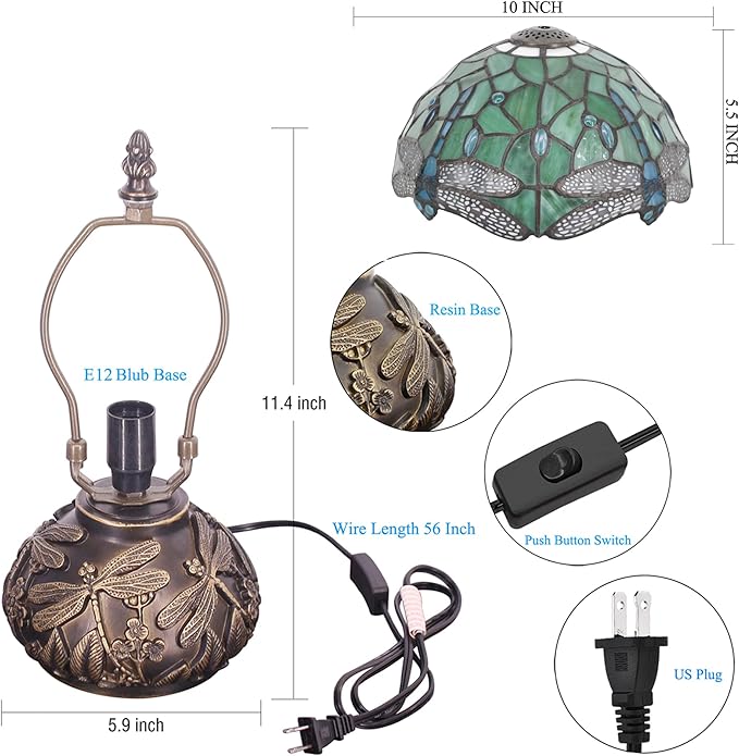 - Product Material: Lampshade handmade, With high-quality stained glass copper foil tin wire welding, Bronze paint resin base, UL certified wire length 56 inch, Push Button Switch.