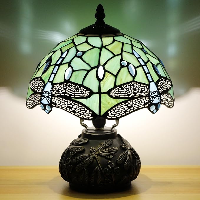 Small Tiffany Table Lamp Light Green Dragonfly Style Stained Glass Desk Lamp 10X11.5 Inch Mushroom Table Light for Office Home Living Room Bedroom