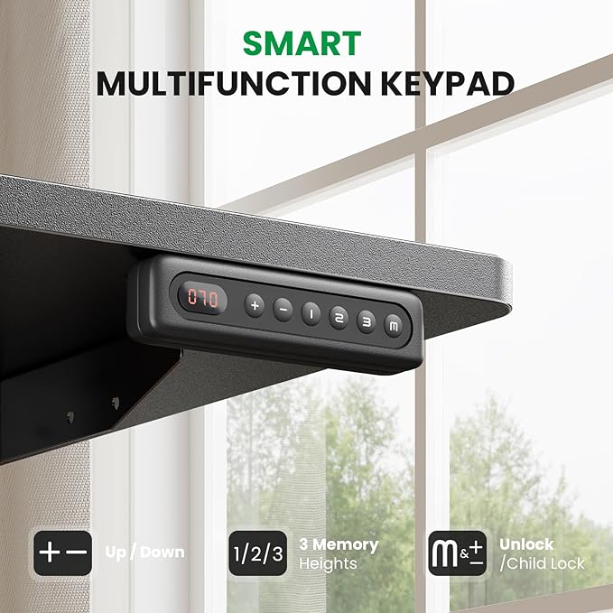 - Customized Sit Stand Desk : The reliable motor operates quietly (under 45 dB)and smoothly, all your things stay steady&secure in motion. The intuitive control panel allows you to preset 3 preferred heights, switch between sitting and standing positions has never been easier. Child lock for total peace of mind.