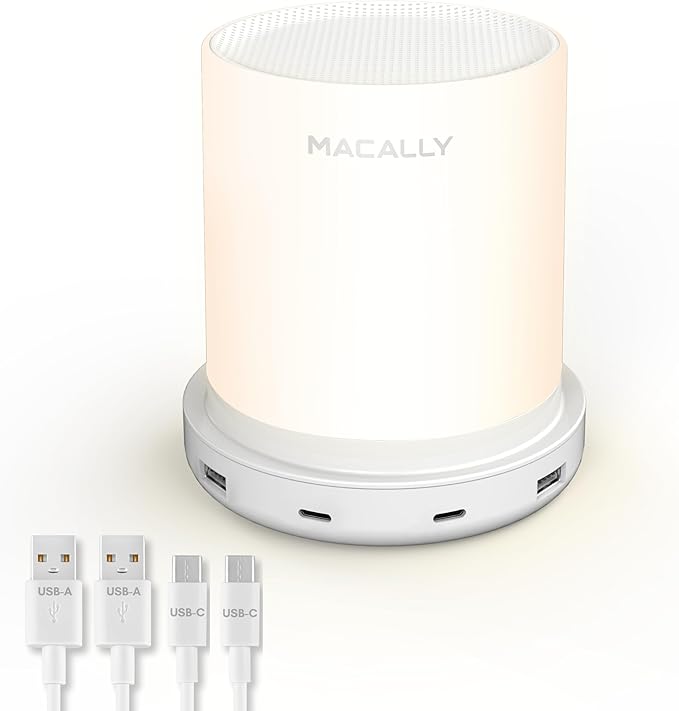Macally Small Bedside Lamp with USB Ports (USB C + A) - Fast Charging Bedside Light and 3 Way Dimmable Touch Lamp for Nightstands - Great as a Night Light and Charger for Bedrooms